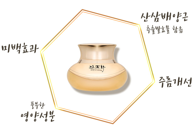 페디오코쿠스/산삼배양근추출발효추출물 화진만의 우수한 기술력으로 개발된 산삼원료로 김치유산균으로 발효시켜 효과적으로 산삼의 영양을 피부에 전달할 수 있게 가공하였습니다. | 한방추출물 황기, 고삼, 감초, 하수오, 동릉초, 희첨, 모란뿌리, 호두, 복숭아나무잎, 잣나무씨, 말굽잔나비버섯, 자주천인국, 뽕나무뿌리 추출물 함유로 피부를 탄력있고 매끄러우며 건강하게 만드는데 도움을 줍니다. | 식약처 고시 기능성원료 함유 아데노신과 알바-비사보롤 함유로 피부의 주름개선에 도움을 주고, 미백에 도움을 줍니다. |