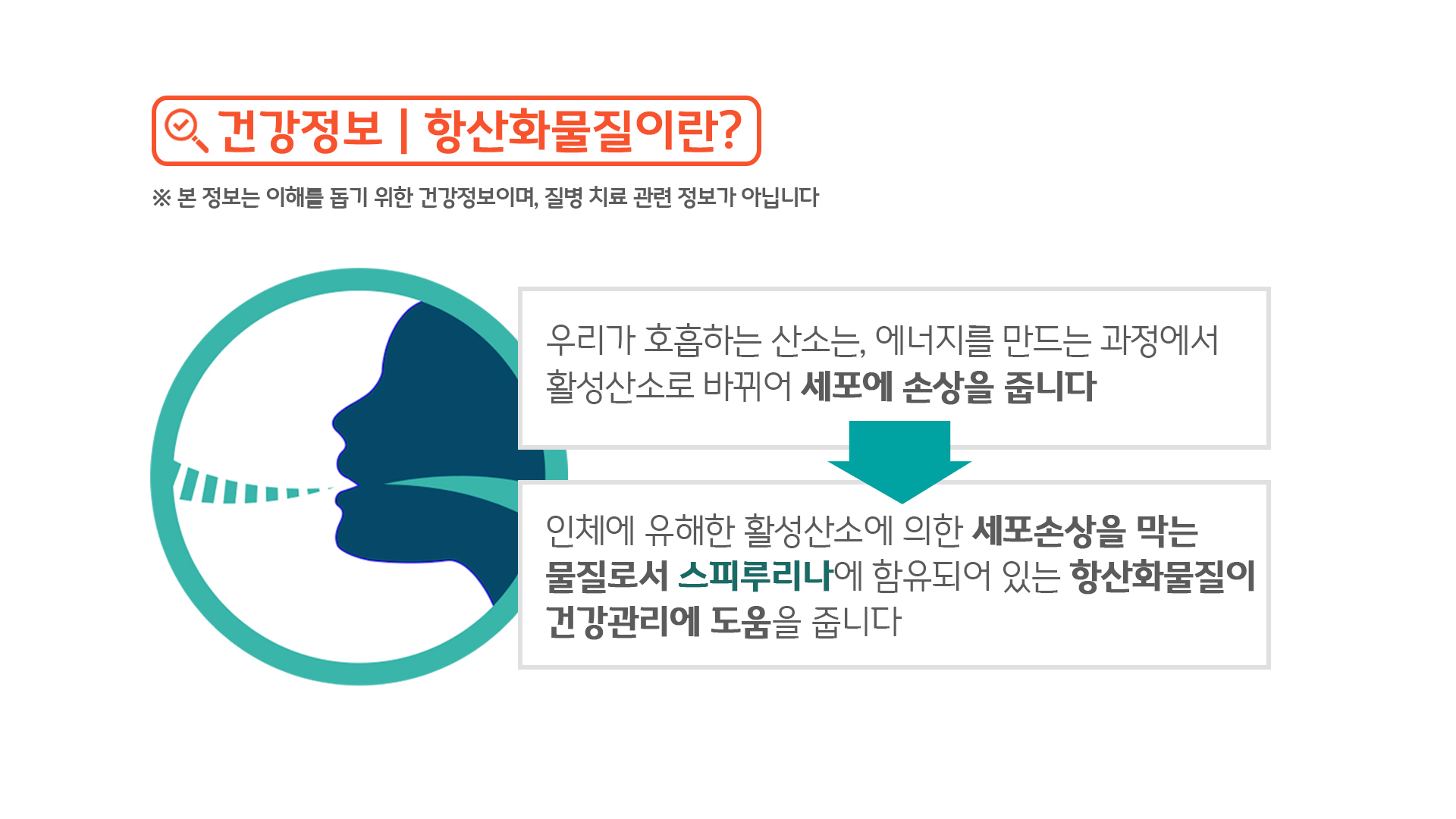 - 인체에 유해한 활성산소에 의한 세포손상을 막는 물질로서 스피루리나에 함유되어 있는 항산화물질이 건강관리에 도움을 줍니다.