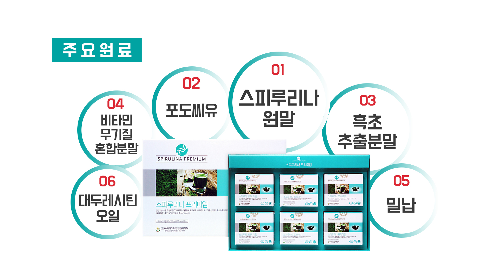 스피루리나원말(미국,방사선조사), 포도씨유(독일), 밀납,대두레시틴오일(대두), 비타민•무기질혼합분말