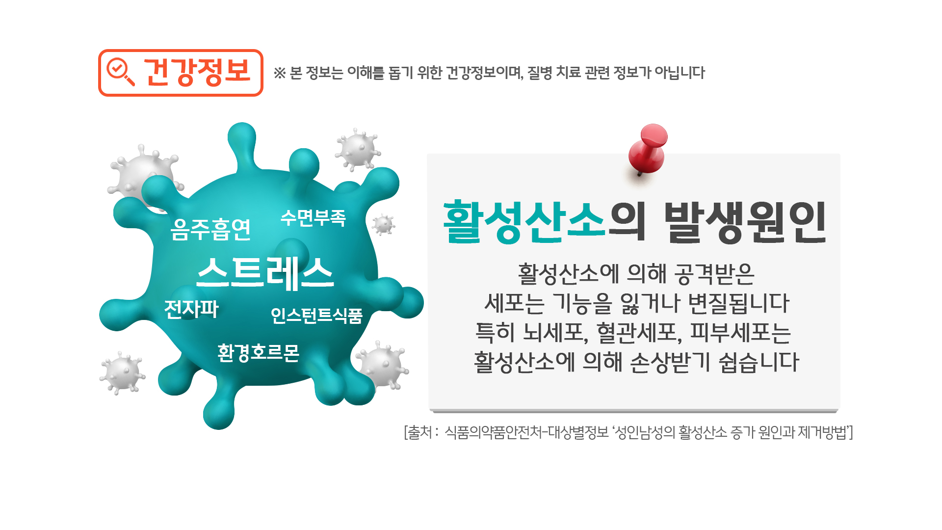 - 우리가 호흡하는 산소는, 에너지를 만드는 과정에서 활성산소로 바뀌어 세포에 손상을 줍니다.