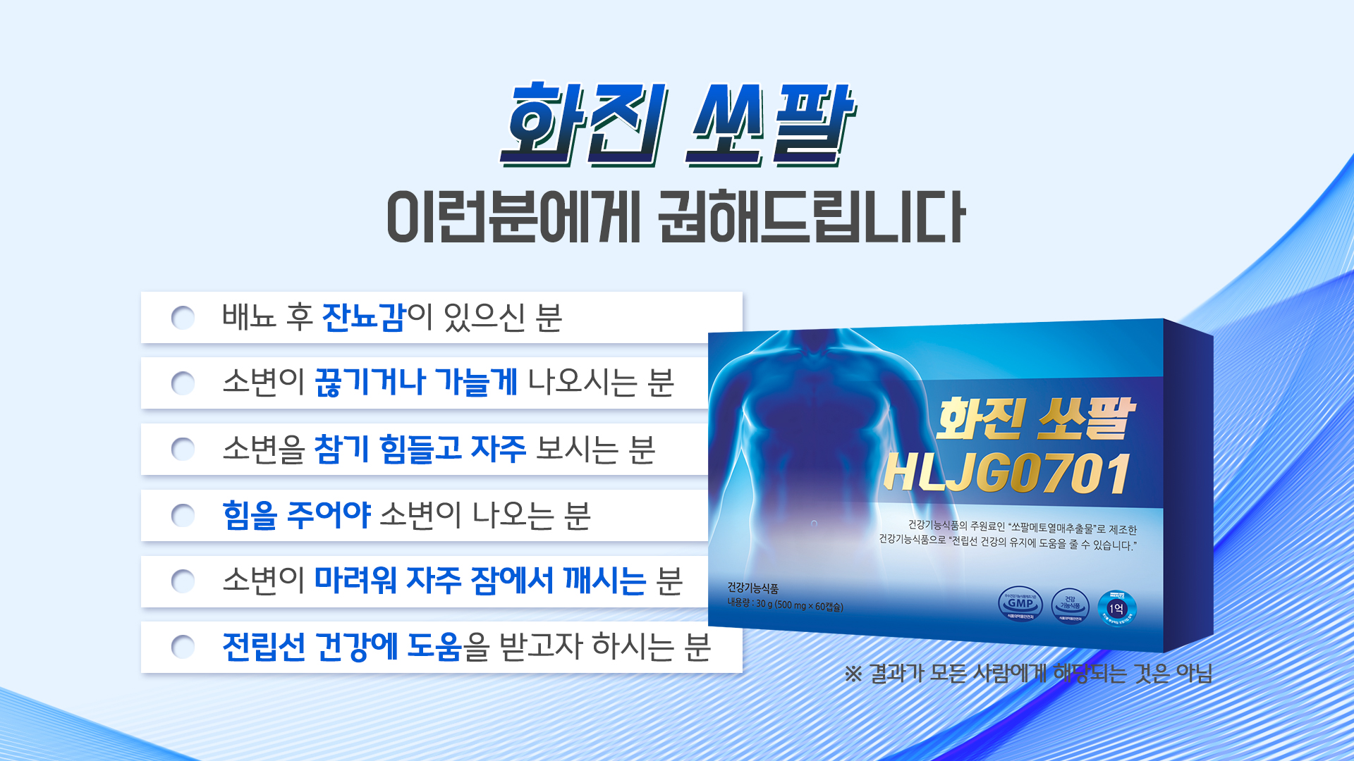 화진쏘팔HLJG0701 제품은 주원료인 쏘팔메토열매추출물에 부원료로 마카추출분말, 식물혼합추출분말, 타우린, 마늘유,가시오가피추출분말, L-아르기닌, 아연, 망간, 산삼배양근추출불효물 등을 첨가하여 만든 연질캡슐로 1일 섭취량 단위로 포장하여 휴대하기 간편한 형태의 건강기능식품으로 전립선 건강의 유지에 도움을 줄 수 있습니다.