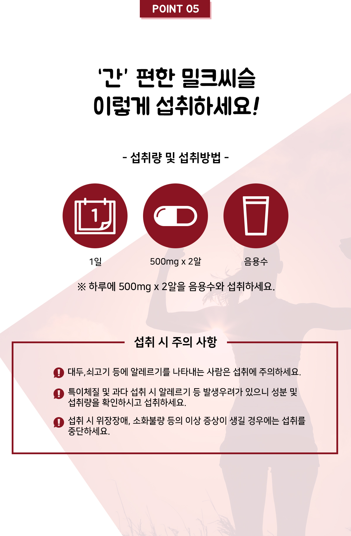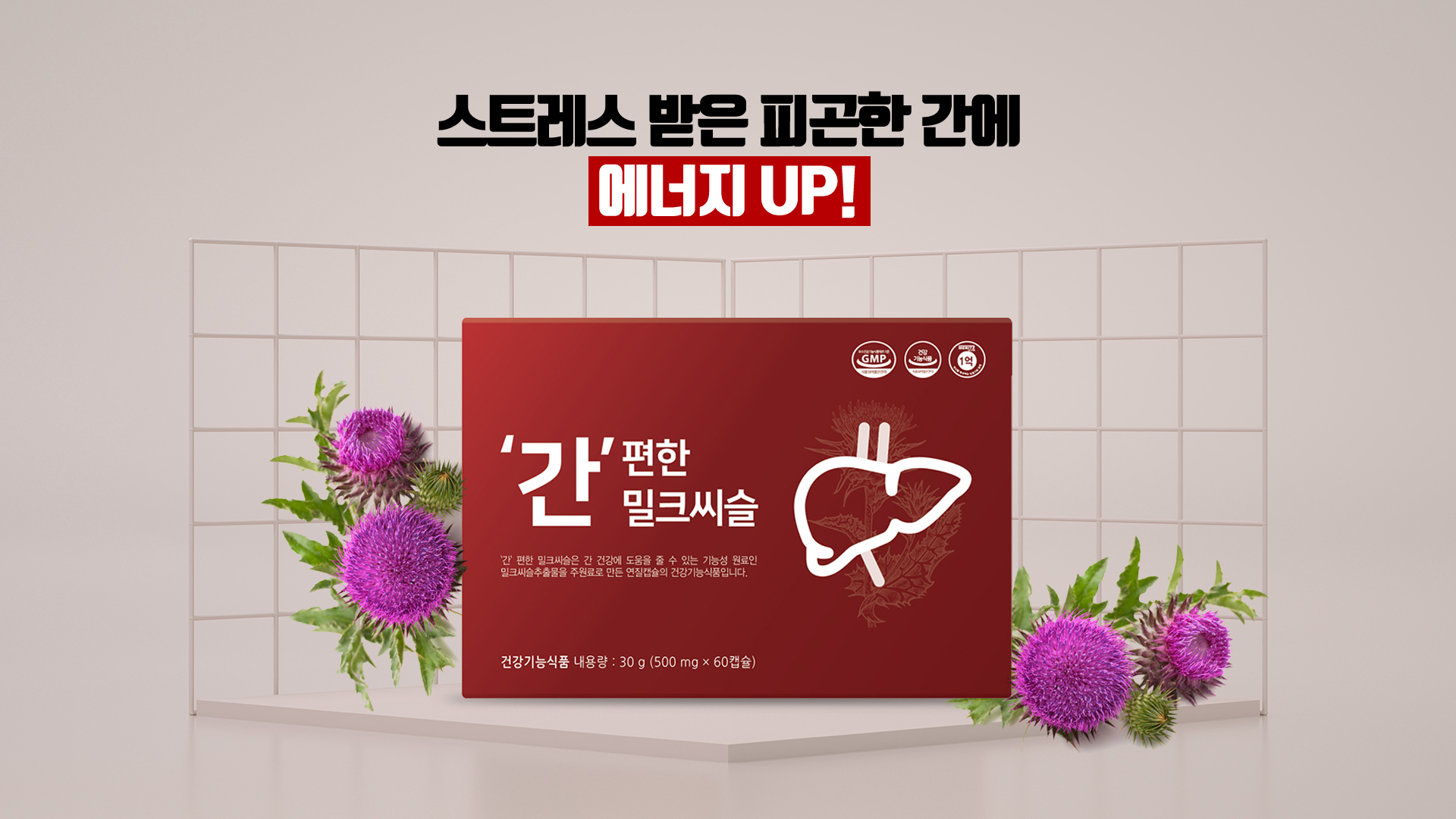 `간 편한 밀크씨슬`제품은 건강기능식품의 주원료인 밀크씨슬추출물에 부원료로효모추출분말,황칠추출분말,헛개나무열매농축액분말,서양민들레추출분말,울금추출분말,버섯혼합추출분말,비타민미네랄혼합분말 등을 첨가하여 만든 연질캡슐로 포장하여 휴대하기 간편한 형태의 건강기능식품으로`간 건강에 도움을 줄 수 있습니다`